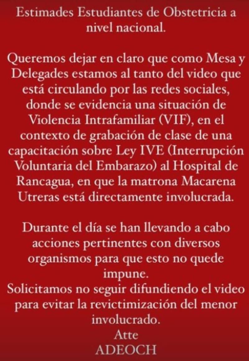 Mientras que el Colegio de Matronas y Matrones de Chile indicó en redes sociales que "ya canalizamos la denuncia por donde corresponde", la Asociación de Estudiantes de Obstetricia de Chile emitió una declaración y entregaron detalles sobre lo sucedido.