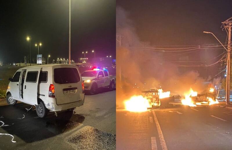 “Efectuaron barricadas en diversas intersecciones del lugar, con vehículos y barricadas con elementos en este caso, madera y neumáticos en combustión”, relató el capitán de Carabineros. “Hay cuatro vehículos incendiados y un vehículo abandonado, que en su interior tenía elementos como miguelitos”.