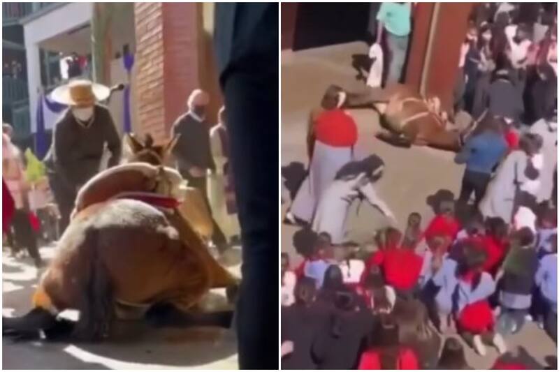 En los registros del evento se ve al animal sufriendo tras caer constantemente al piso ante la presencia de los alumnos.