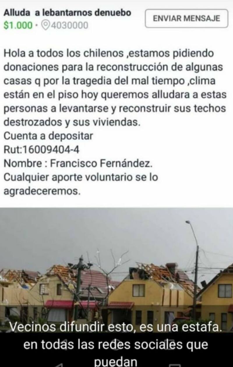 "Hola a todos los chilenos, estamos pidiendo donaciones para la reconstrucción de algunas casa que por la tragedia de mal tiempo, clima, están en el piso", escribió en una publicación que se habría difundido en distintos grupos de la mencionada red social.