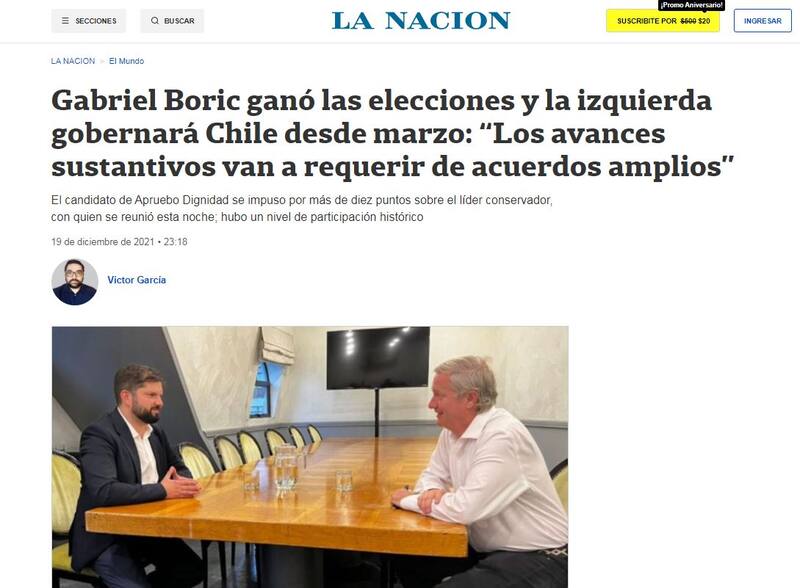 En Argentina, La Nación subrayó el hecho de que ambos candidatos, Boric y Kast, se reunieran tras el triunfo del líder de Apruebo Dignidad.