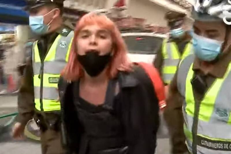 Camila Moreno, fue detenida, subida al vehículo policial y fue trasladada hasta la Primera Comisaría Santiago Central, donde está a la espera de lo que dictamine el Ministerio Público.
