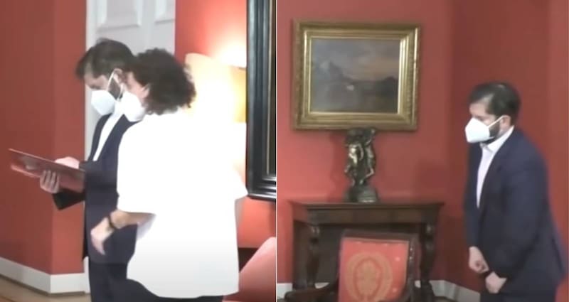 En el video, se capta el momento en que el Presidente Gabriel Boric recibe en La Moneda al presidente del Senado, Álvaro Elizalde (PS), quien llegó acompañado por la vicepresidenta, Luz Ebensperguer (UDI).