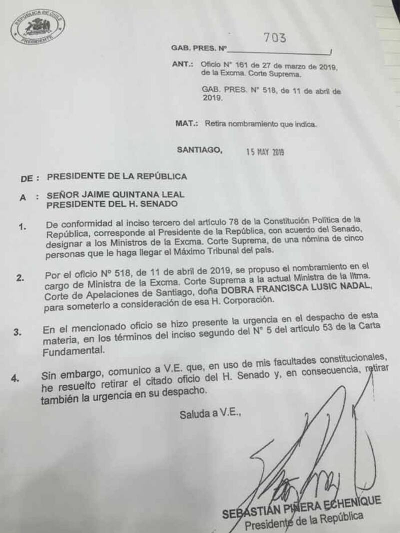 Durante toda la mañana se realizarin negociaciones para conseguir el apoyo a Lusic, pero luego de que éstas no fructificaran se decidió bajar no solo la nominación de la jueza, sino también retirar el oficio que había enviado el Presidente Sebastián Piñlera con los nombres de los cinco nominados y quitarle la urgencia a su despacho.