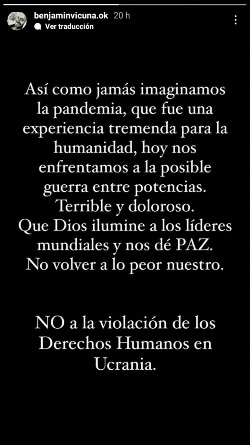 “Así como jamás imaginamos la pandemia, que fue una experiencia tremenda para la humanidad, hoy nos enfrentamos a la posible guerra entre potencias”, inició escribiendo en Instagram
