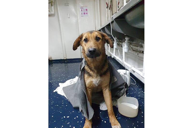 La llegada del perrito con alma de marinero fue celebrada por la tripulación. Yuivar es uno de los más felices: "Ahora sólo se debe recuperar de su fatiga muscular. Mientras, nos seguimos encariñado con el perro".