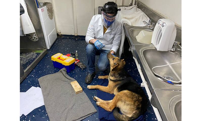 "Fue bañado con agua dulce y tibia. Lo abrigamos para tratar de sacarlo de una condición de mucho frío y posible hipotermia. Lo alimentamos y ya el martes un veterinario pudo ir a verlo, constatando que las medidas iniciales que tomamos fueron las correctas y él está mejorando", comentó el Capitán de Corbeta Federico Cavada, Comandante de la Unidad naval.