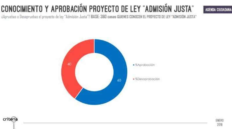 En cuanto a materia educacional un 55% de los encuestados dijo no conocer el proyecto Admisión Justa. En tanto que el 45% que afirmó conocerlo, un 60% de ellos dijo aprobar el proyecto de ley.