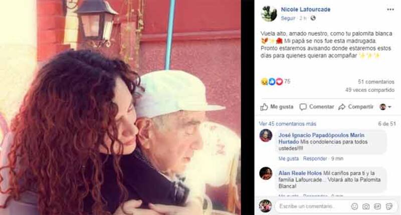 "Vuela alto, amado nuestro, como tu palomita blanca. Mi papá se nos fue esta madrugada. Pronto estaremos avisando donde estaremos estos días para quienes quieran acompañar", posteó Nicole Lafourcade en su Facebook.