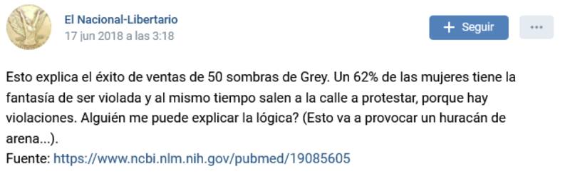 Por ejemplo, compartió una publicación de Facebook con un link a un estudio para criticar las protestas femeninas en las calles. "Esto explica el éxito de ventas de 50 sombras de Grey. Un 62% de las mujeres tiene la fantasía de ser violada y al mismo tiempo salen a la calle a protestar, porque hay violaciones. ¿Alguien me puede explicar la lógica? (Esto va a provocar un huracán de arena...)", escribió en 2018.