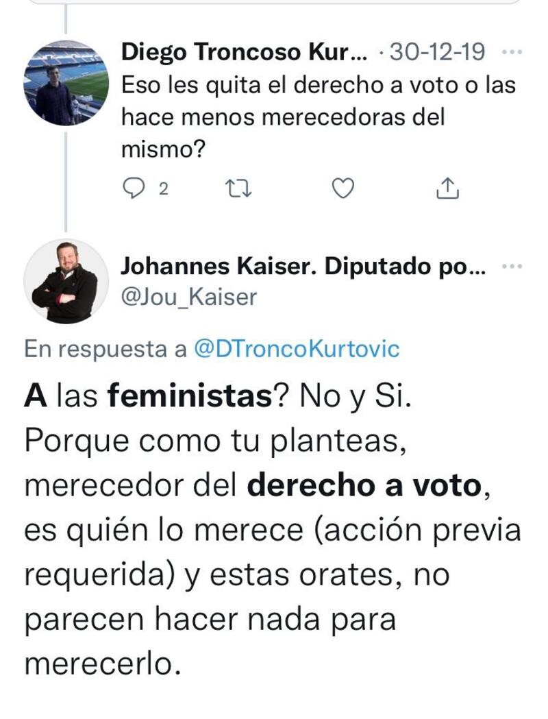 "Lo que pasa es que también tienes ahí una especie de esquizofrenia. Las mujeres dejan de ir al parque a trotar porque tienen miedo a inmigrantes que las pueden violar, pero siguen votando por los mismos partidos que están trayendo a esa gente y tu realmente te preguntas si el derecho a voto fue una buena idea", planteó Kaiser, quien salió electo con 11,7% de los votos en el distrito 10 (Santiago, Providencia, Ñuñoa, Macul, San Joaquín y La Granja).