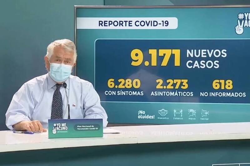 Según el reporte del Minsal, en la últimas 24 horas se registraron 9.171 contagios. De esta cifra, 6.280 corresponden a casos sintomáticos, 2.273 son asintomáticos y 618 son casos sin notificar.