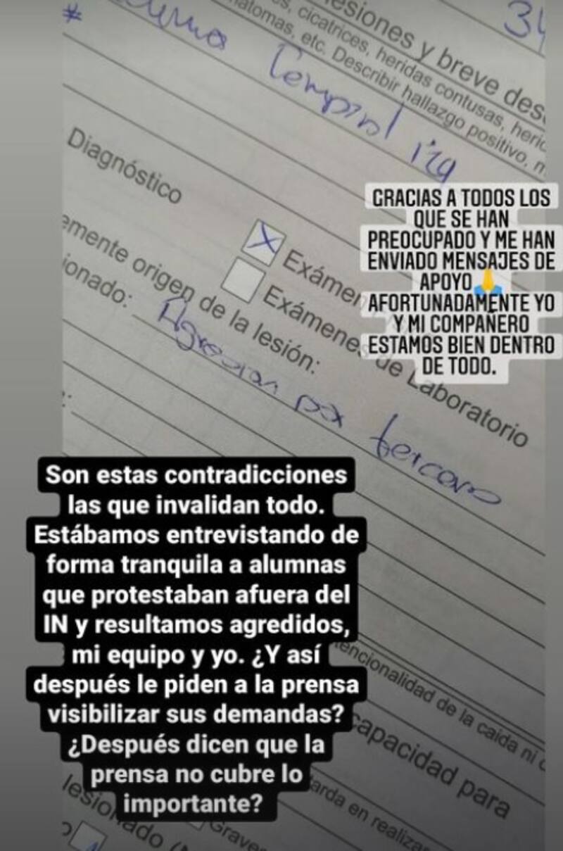 De paso, explicó que “estábamos entrevistando de forma tranquila a alumnas que protestaban fuera del IN y resultamos agredidos, mi equipo y yo”.