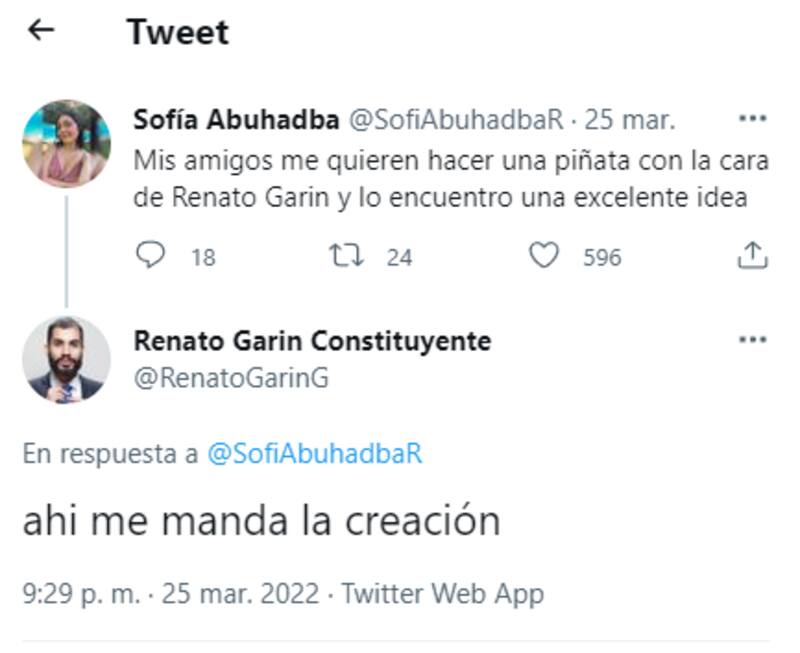 Según informaciones que reunió CNN Chile y que fueron revisadas por La Cuarta, el 25 de marzo una usuaria de Twitter identificada como Sofía Abuhabda subió una publicación en la que escribió: “mis amigos me quieren hacer una piñata con la cara de Renato Garín y lo encuentro una excelente idea”.