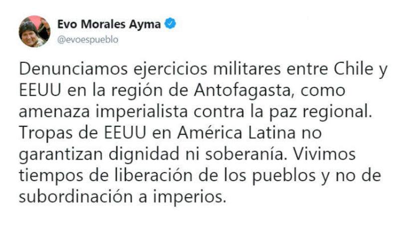 Con este mensaje, Evo Morales se refirió a la supuesta amenaza chilena en el norte del país. De acuerdo al presidente boliviano "tropas de EEUU en América Latina no garantizan dignidad ni soberanía.