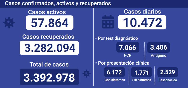 Finalmente, este domingo el Ministerio de Salud informó 10.742 nuevos casos de coronavirus, con una positividad del 13,03%. Además, fallecieron 78 personas en las últimas 24 horas.