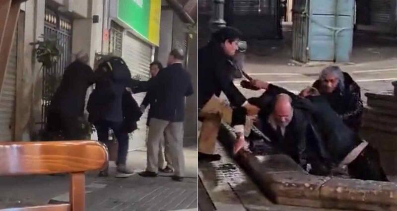 Se trata de un video que se viralizó esta semana y que muestra a cuatro trabajadores que se agarran a combos y terminan al interior de una pileta ubicada en el pasaje Matías Cousiño, justo al frente del Bar Nacional.