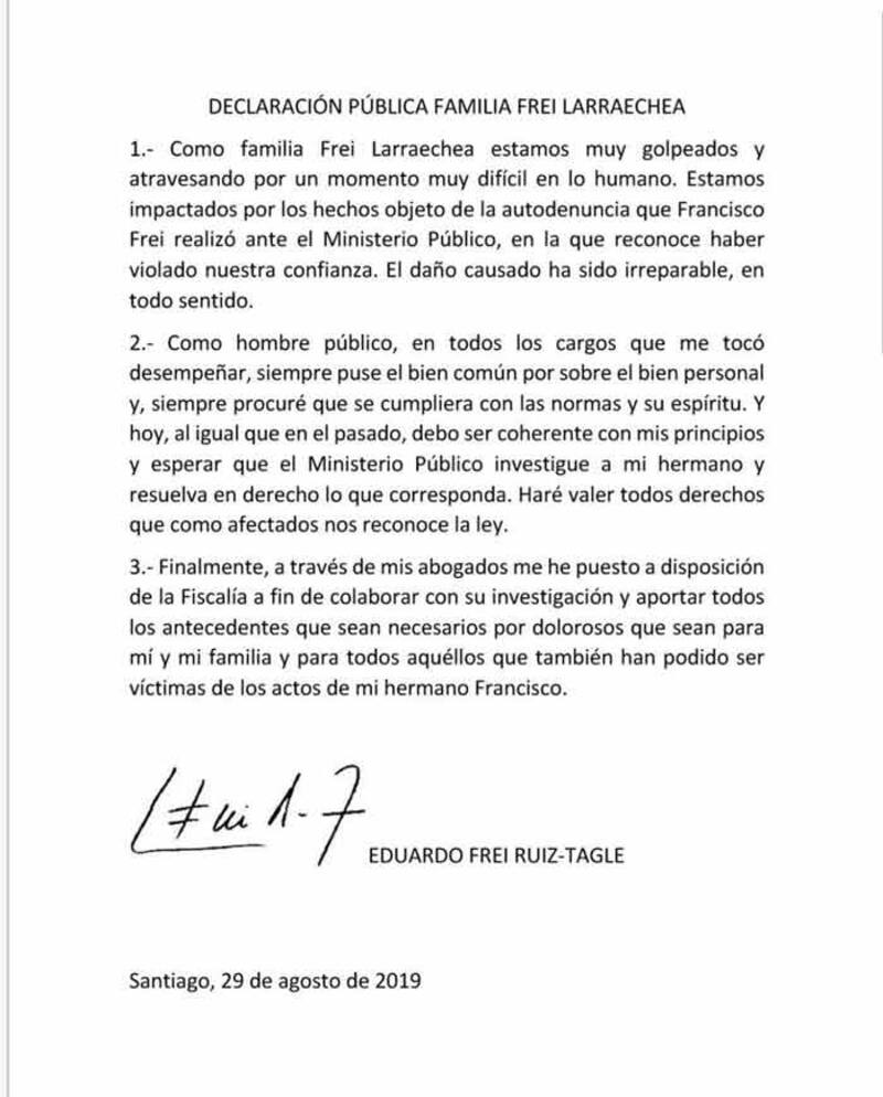 "Estamos impactados por los hechos objeto de la autodenuncia que Francisco Frei realizó ante el Ministerio Público, en la que reconoce haber violado nuestra confianza. El daño ha sido irreparable, en todo sentido", parte el texto entregado por la familia.
