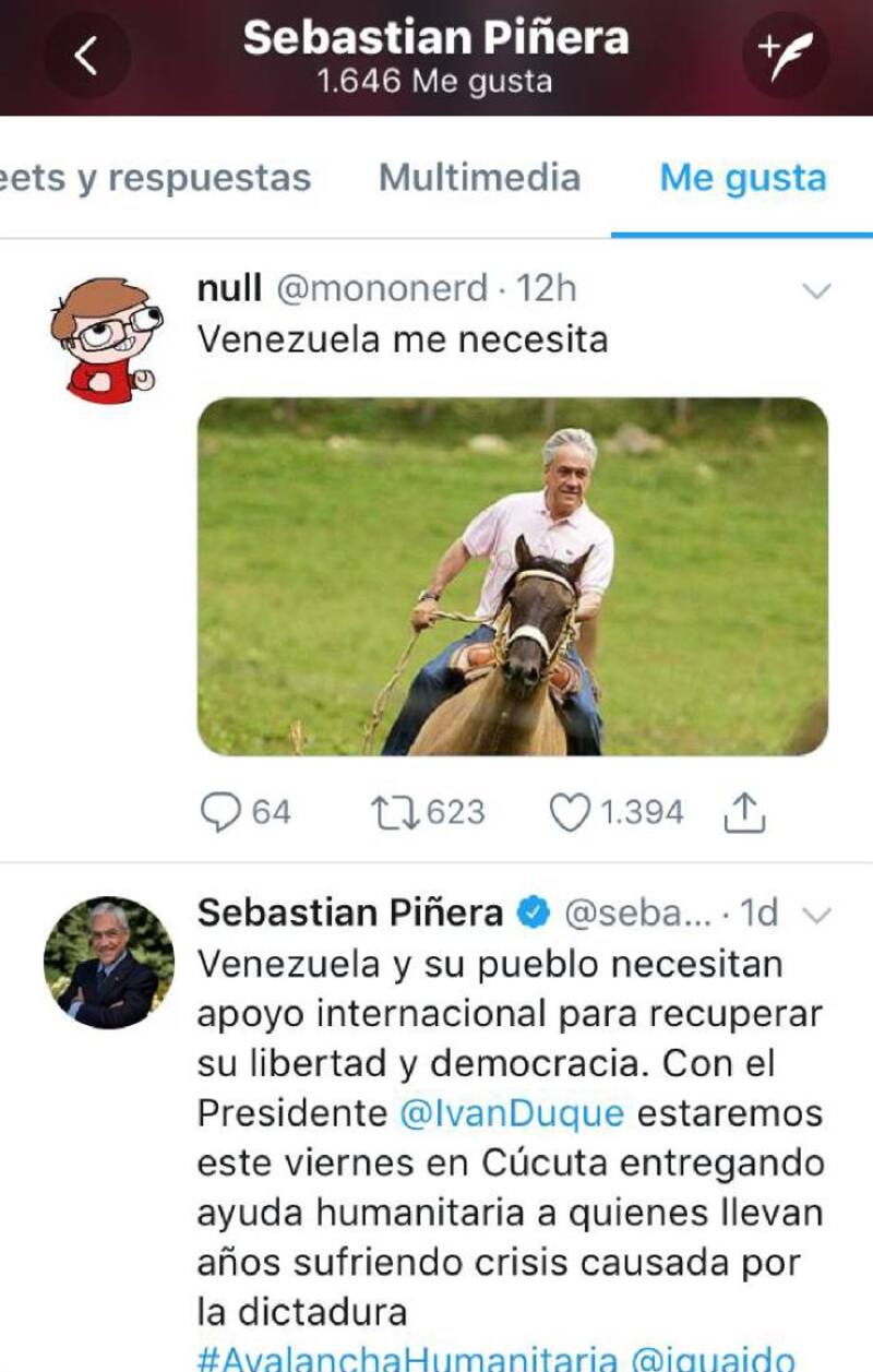Al parecer, Piñera también se encontró con meme suyo en la red social. En la imagen, se le ve montado sobre un caballo y con la frase "Venezuela me necesita". Con o sin intención, el Presidente le puso "like".