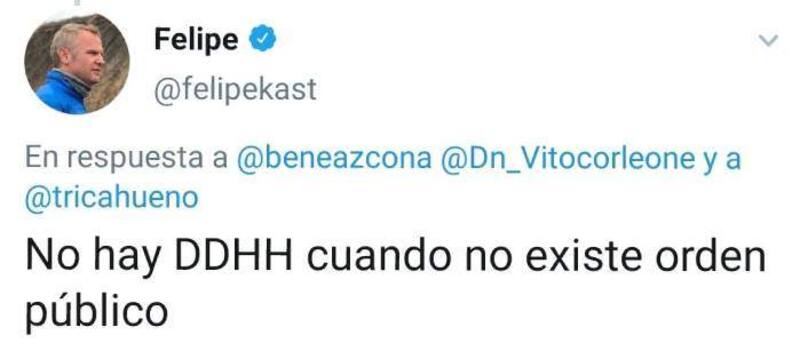 Tras ser increpado por varios usuarios, Kast se defendió. "No la saques de contexto, cuando no hay orden público se vulneran los DDHH de miles de personas, y el desafío de toda democracia es lograr que nunca las fuerzas de orden vulneren los DDHH, y al mismo tiempo garanticen el orden público", explicó.