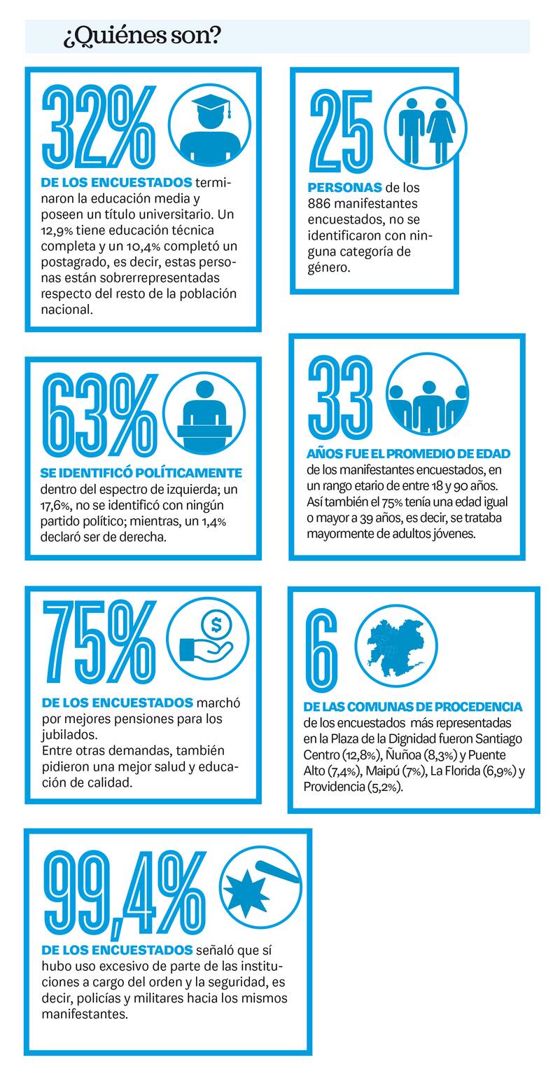La investigación fue elaborada a través de encuestas realizadas a los concurrentes de la Plaza Baquedano (rebautizada por los manifestantes como Plaza de la Dignidad) a 886 personas, mayores de 18 años, durante el mes de noviembre.