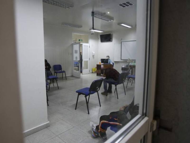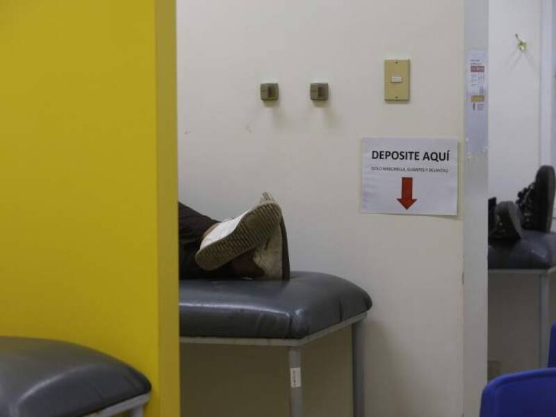 Se ouede observar a pacientes acostados en las camillas junto con un cartel señalando que se debe depositar ciertos objetos.