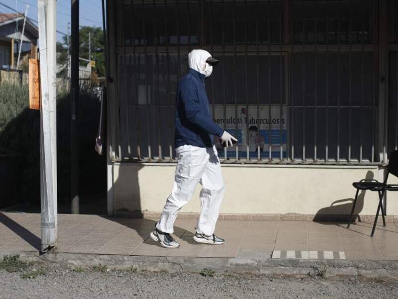 Sujeto va caminando con su protección ante el contagio. Cuenta con mascarilla, guantes y una ropa que cubre toda la superficie de su cuerpo para evitar cualquier contacto con el virus.