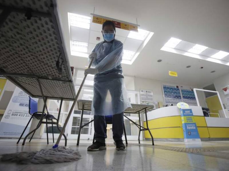 Funcionario limpia el piso del centro de salud con todas las medidas de seguridad necesarias.