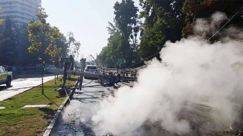 El accidente ocurrió en la intersección de la avenida Vitacura con Valle Central, donde el vehículo con patente brasileña causó la caída de los postes, que además de generar el corte de la electricidad, provocó "daños a domicilios y en algunas casas producto del movimiento del tendido eléctrico", según precisó el capitán de 37° comisaría de Vitacura, Gustavo Esperidion.