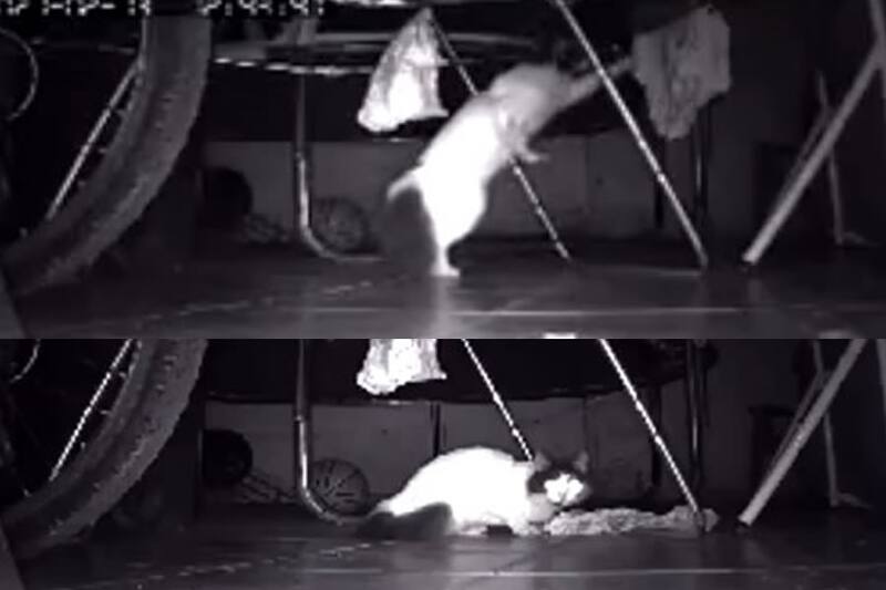 Un gato blanco con manchas oscuras fue grabado robando ropa íntima desde un hogar en la comuna santiaguina.