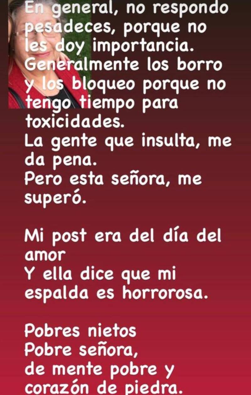 "Mi post era del día del amor y ella dice que mi espalda es horrorosa. Pobres nietos, pobre señora, de mente pobre y corazón de piedra", remató.