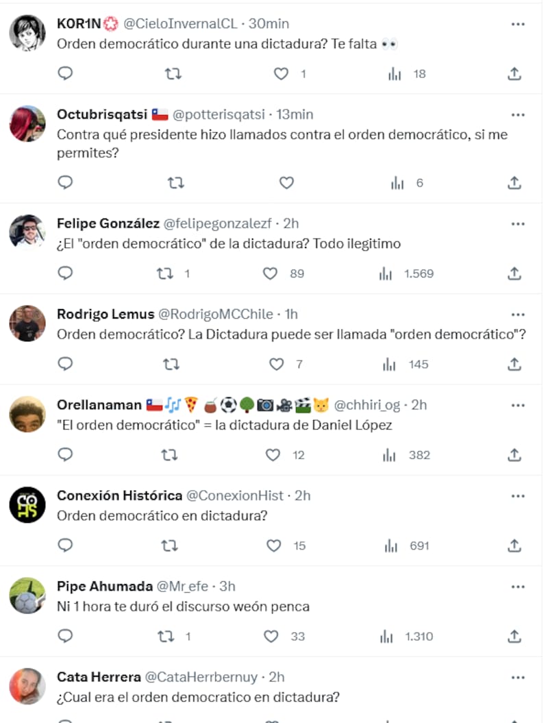 “¿Orden democrático durante una dictadura? Te falta”, puntualizó @CieloInvernalCL. “¿Contra qué presidente hizo llamados contra el orden democrático?, si me permites”, recalcó @potterisqats.