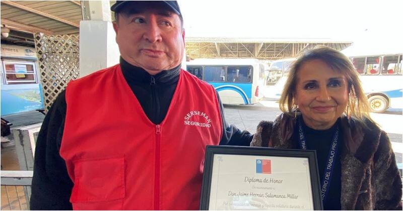 “Hoy se entregó reconocimiento a guardia, luego de que en redes se viralizara el agradecimiento de una mujer que quedó sola tras perder el bus en el terminal Rural de Los Ángeles, lugar en donde fue acompañada por don Jaime Salamanca, quien no la dejó sola en ningún momento”, difundieron desde la Seremi de Trabajo de la región.