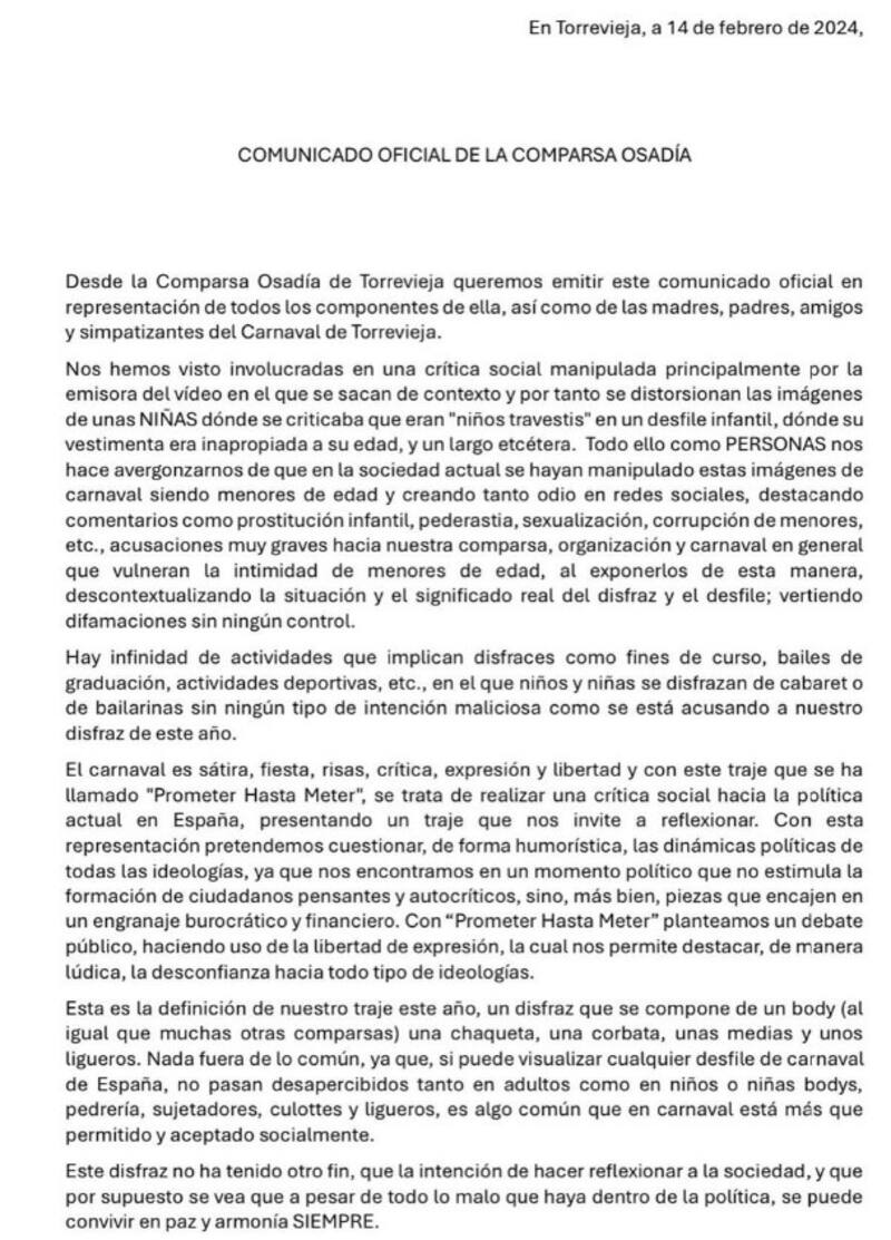 En medio de la batahola y días después del carnaval, la Comparsa publicó un comunicado respondiendo las acusaciones y lamentando que en la web se haya expuesto a las niñas de manera “descontextualizada”.
