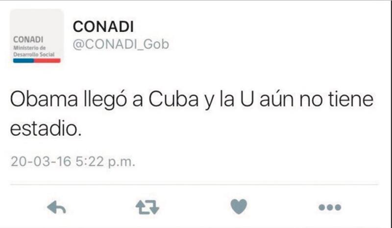 El domingo a las 17.22 alguien a cargo de la cuenta de Twitter de la Corporación Nacional de Desarrollo Indígena al tanto de la histórica visita del presidente de EE.UU. al caribe escribió: ''Obama llegó a Cuba y la U aún no tiene estadio''. ¡Chan!
