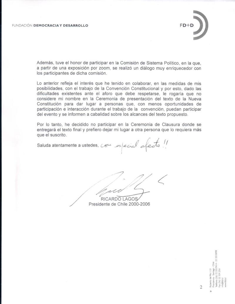 “Lo anterior refleja el interés que he tenido en colaborar, en las medidas de mis posibilidades, con el trabajo de la Convención Constitucional y por esto, dado las dificultades existentes ante el aforo que debe respetarse, le rogaría que no considere mi nombre en la Ceremonia de presentación del texto de la Nueva Constitución”, expresó explicando sus razones.