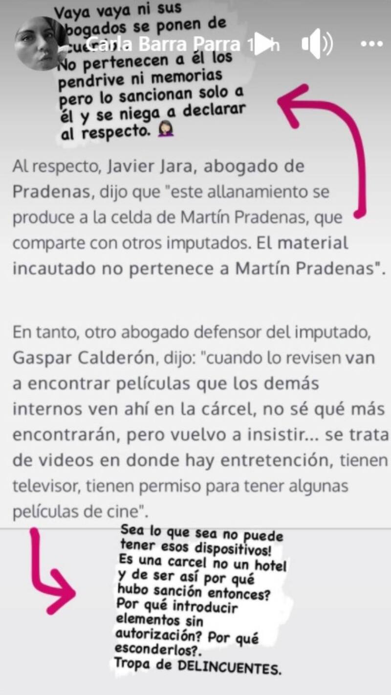 "Vaya vaya ni sus abogados se ponen de acuerdo. No pertenecen a él los pendrive ni memorias, pero lo sancionan solo a él y se niega a declarar al respecto", apuntó la joven.