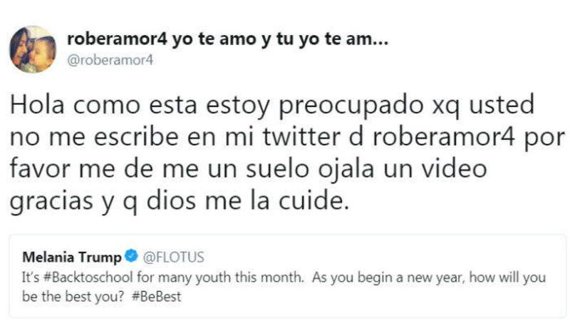 Con este mensaje, el pasado 7 de agosto el tuitero chileno @roberamor4 mostró su preocupación ante la nula respuesta de Melania Trump. Sí, la mismísima esposa de Donald Trump.