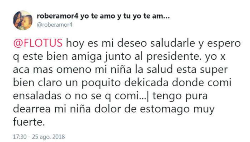 "Hoy es mi deseo saludarle y espero q este bien amiga junto al presidente. yo x aca mas omeno mi niña la salud esta super bien claro un poquito dekicada donde comi ensaladas o no se q comi... tengo pura dearrea mi niña dolor de estomago muy fuerte", escribió este sábado.