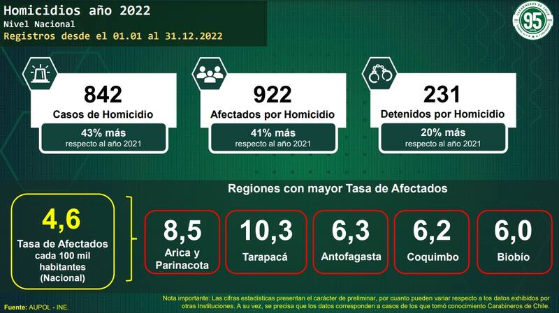 De acuerdo al informe presentado por Carabineros, la Región de Antofagasta terminó el 2022 con una tasa de 6,3 afectados por homicidio por cada 100 mil habitantes. En segundo lugar está la Región de Arica y Parinacota (8,5) y en lo más alto de este preocupante listado se encuentra la Región de Tarapacá, con una tasa de 10,3 afectados por homicidio por cada 100 mil habitantes.