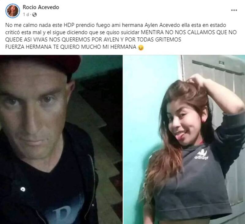 Una de las hermanas de Ayelén expresó toda su indignación en Facebook: “No me calmo nada. Este hdp prendió fuego a mi hermana Aylén Acevedo. Ella está en estado crítico, está mal y él sigue diciendo que se quiso suicidar. Mentira, no nos callamos, que no quede así. Vivas nos queremos, por Aylén y por todas, gritemos”.