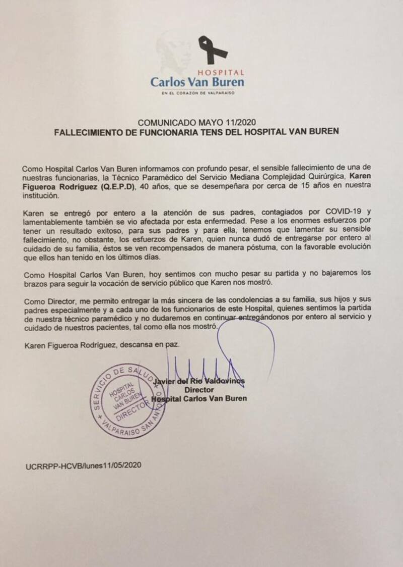 A través de un comunicado comunicaron el fallecimiento de Karen Figueroa (40 años) quien se desempañaba hace 15 años en la institución.