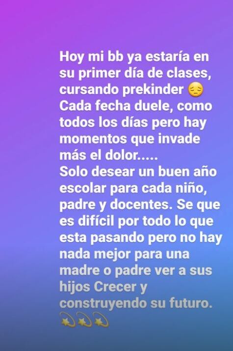 Este miércoles, la joven recordó al pequeño en el marco del inicio de las clases presenciales. “Hoy mi bebé ya estaría en su primer día de clases, cursando prekinder”, lamentó.