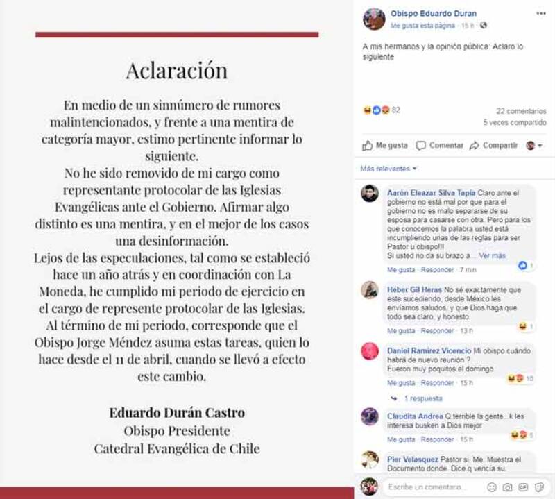 Tras conocer su destitución por parte de la Iglesia Metodista Pentecostal, Durán publicó una "aclaración· en las redes sociales, donde afirma que "no he sido removido de mi cargo como representante protocolar de las Iglesias Evangélicas ante el Gobierno. Afirmar algo distinto es una mentira y, en el mejor de los casos una desinformación".