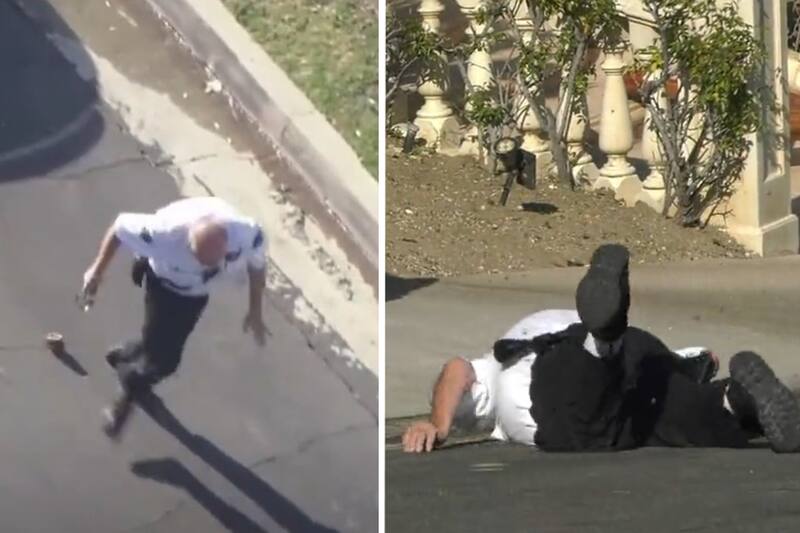 Desesperado, el hombre comienza a correr, tropieza y cae violentamente en el pavimento, golpeándose en el rostro.