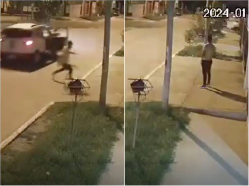Otro registro muestra que el conductor hizo una acción parecida: se lanzó desde el auto y rodó por el piso, para luego esconderse detrás de un árbol.