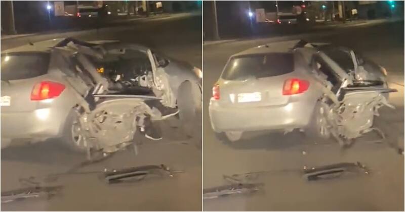 En los videos, se puede ver el insólito momento en que el auto intenta darse a la fuga con todo el costado derecho destruido y sin la puerta del copiloto. Además, se puede ver a una persona en dicho asiento, pero se desconoce el estado en el que se encontraba.