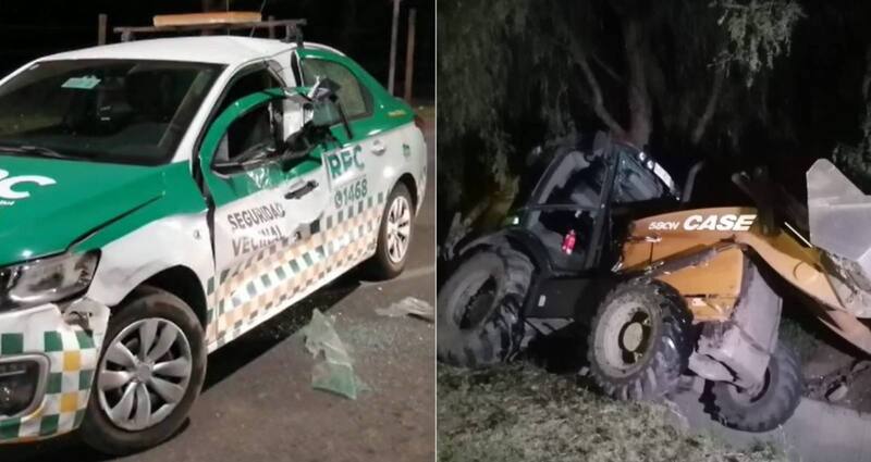 Fue en este contexto que se sumó un vehículo de seguridad municipal, el que terminó siendo embestido por la retroexcavadora en el costado izquierdo.