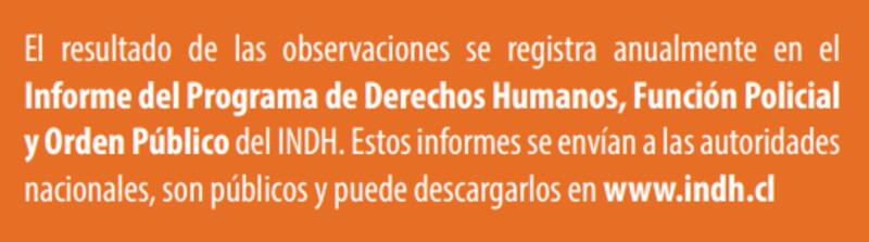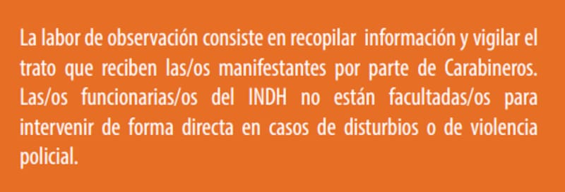 Su rol en las manifestaciones es el siguiente: vigilar que Carabineros de Chile y ahora también las Fuerzas Armadas, como instituciones del Estado, cumplan su labor de mantener el orden público respetando el derecho a manifestarse de las personas participantes, independientemente de si la manifestación fue previamente autorizada o no", respetando el "Derecho a manifestarse"