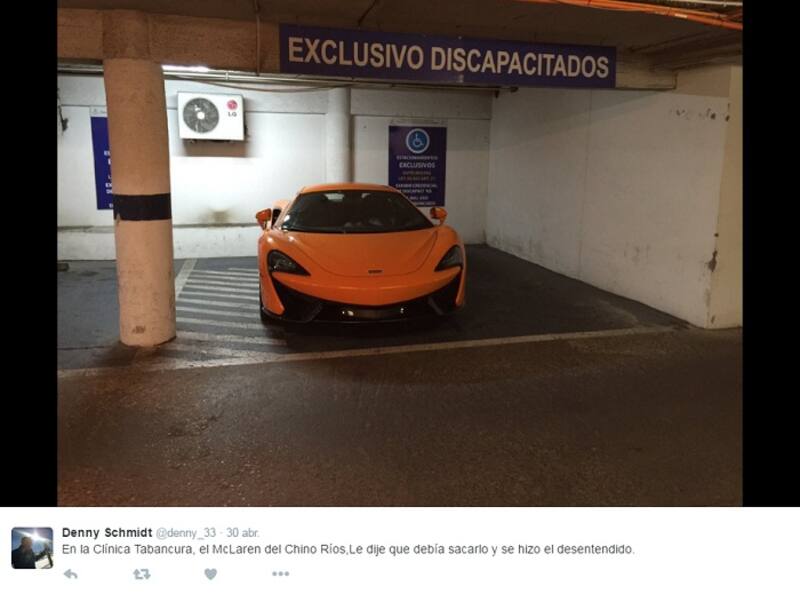 "Le saqué una foto y le pedí al guardia que retirará el vehículo. Ahí él me dijo que era de Marcelo Ríos. Le pedí -a Marcelo- que sacara el auto del lugar de discapacitados pero él iba hablando por teléfono y no hizo nada", soltó Denny Schmidt, el hombre que subió la imagen a Twitter. Y que el reciente sábado llevaba a su hija a la clínica.